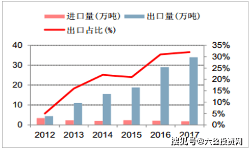 我国己二酸进出口(万吨)和出口占比(%)情况