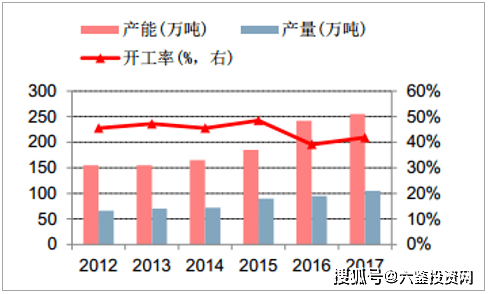中国己二酸供给与需求:产能方面, 国内己二酸产能从 2012 年的 155 万吨增加到 2017 年的 255 万吨,产能复合增速为 10%。 产量方面, 2012-2017 年产量由 66 万吨增加到了 105 万吨,产能复合增速为 9.7%。 国内需求方面, 2012 年需求量为 63 万吨, 2017 年需求量为 78 万吨,复合增速为 9.7%,和产量的增速完全匹配。 进出口方面, 2011 年进出口量都偏小,进口略大于出口; 2016 年进口 2 万吨,出口量为 29 万吨,出口占总产量比例为 31%; 产能利用率方面, 2012-2016 年产能开工率基本维持在 45%上下,己二酸是产能严重过剩行业。停产产能多: 国内目前合计有近 60 万吨的产能处于长时间停产状态。