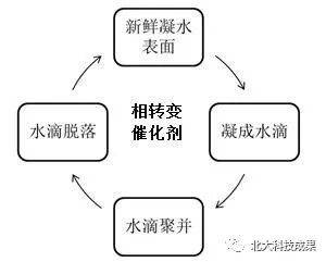 通过纺制异形聚酰胺纤维(指尼龙6)来提高聚酰胺纤维的凝水性能,相当于做一种相转变催化剂,实现“新鲜凝水表面-凝成水滴-水滴聚并-水滴脱落-新鲜凝水表面”这样一个循环(如图),从而提高人类从空气中取水的效率。